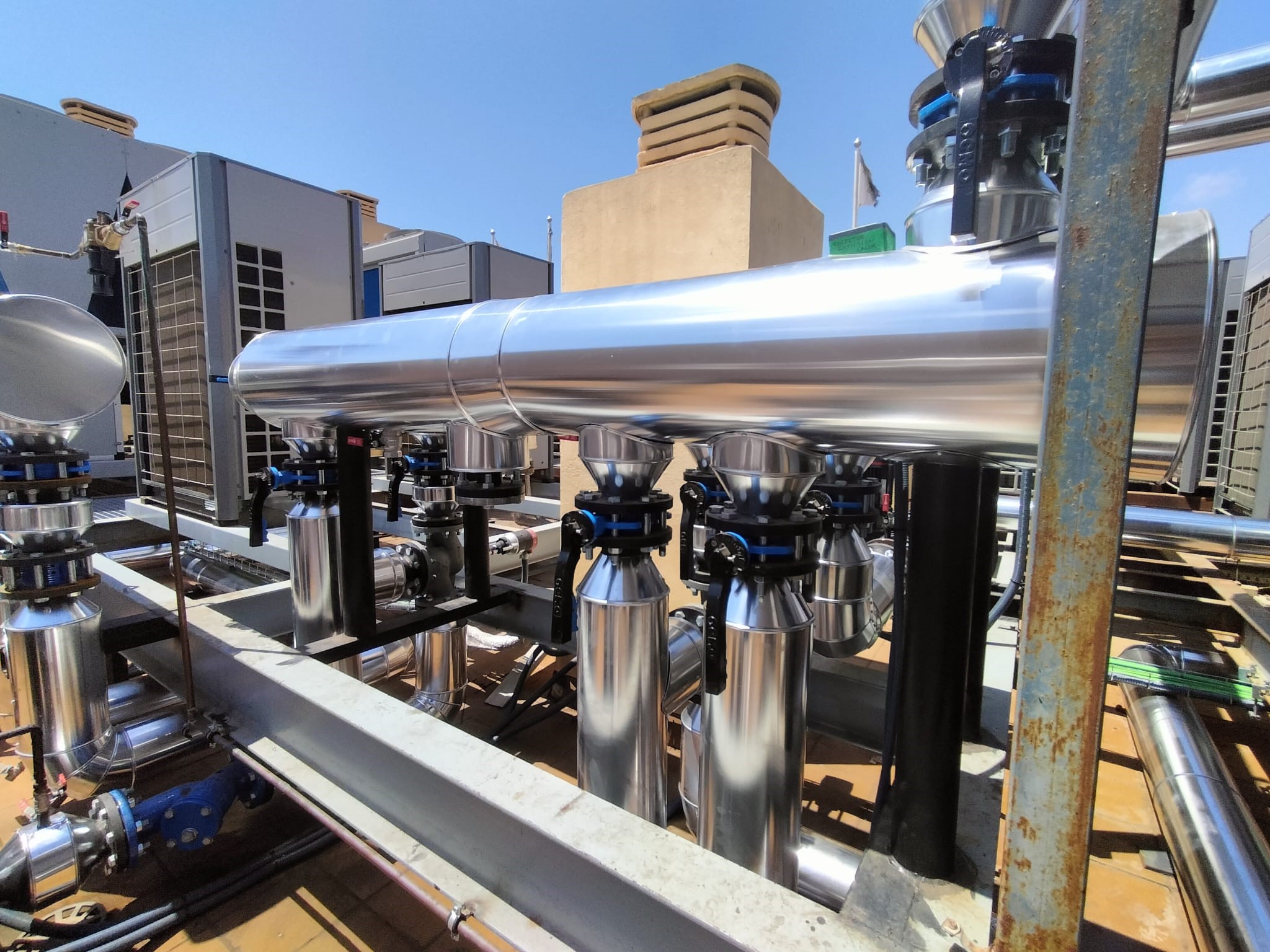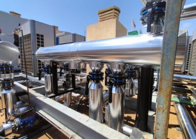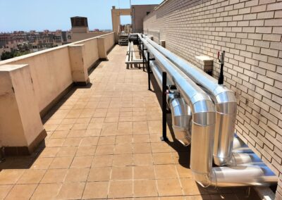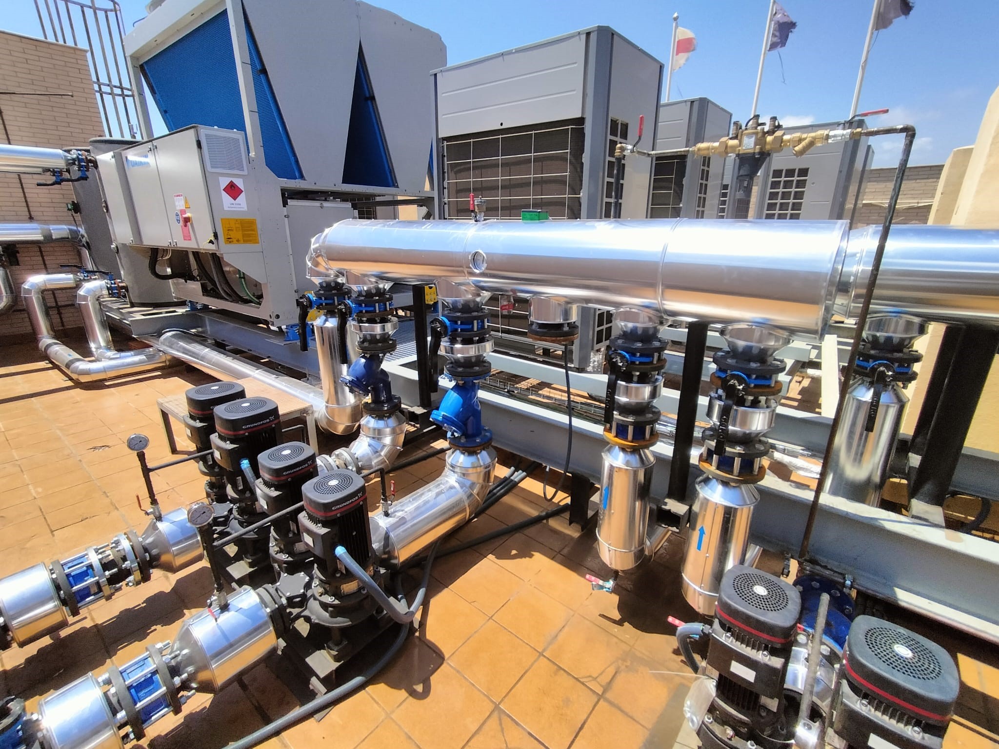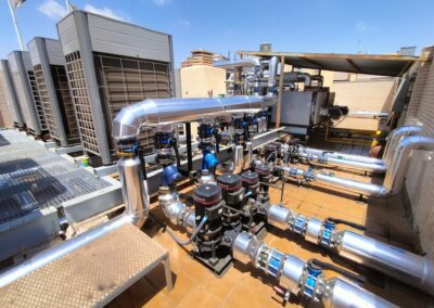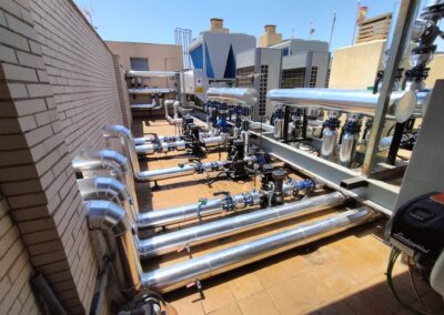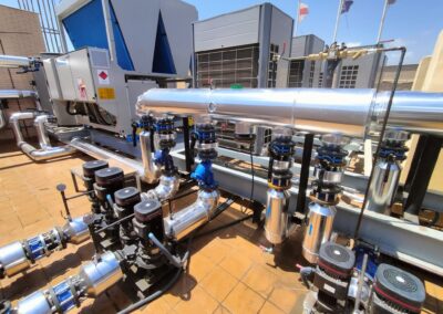 Se ha ejecutado una completa red de distribución y transporte en la cubierta del hotel, incorporando colectores de hierro de 6”, tuberías, bombas hidráulicas y diversos accesorios. Esta infraestructura está diseñada para garantizar un funcionamiento fluido y eficiente del sistema de climatización.