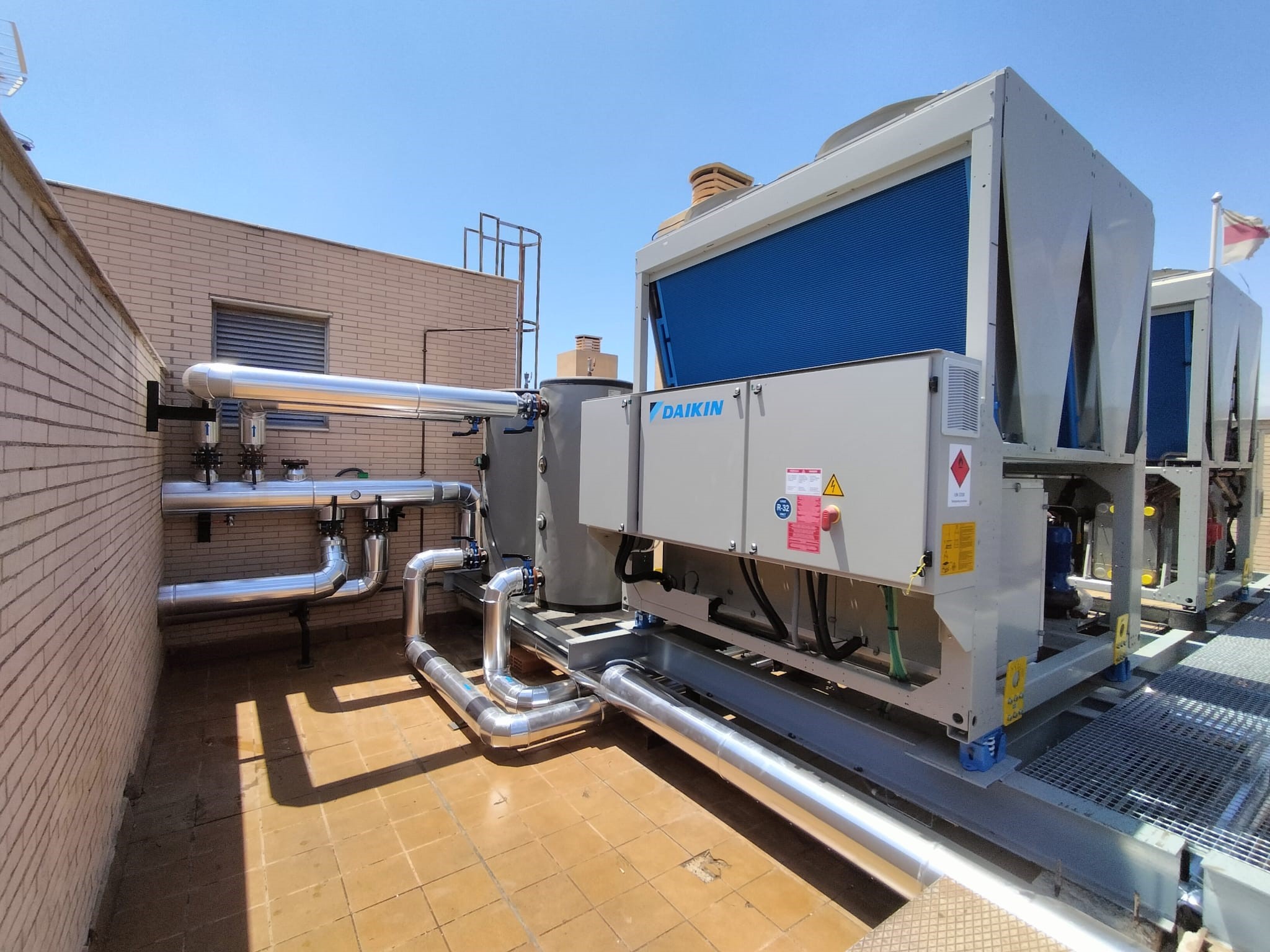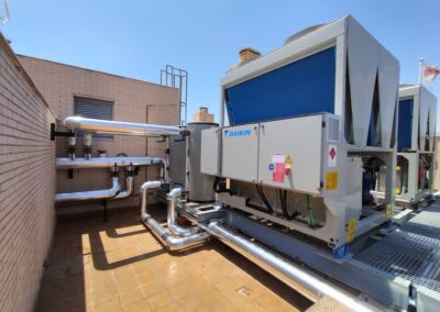 En el corazón de esta ampliación se encuentra la instalación de dos enfriadoras aire-agua de la reconocida marca DAIKIN, cada una con una potencia frigorífica de 201 kW. Este sistema incluye una enfriadora con recuperación parcial de calor, destacándose por su eficiencia energética y capacidad para optimizar el uso de recursos.