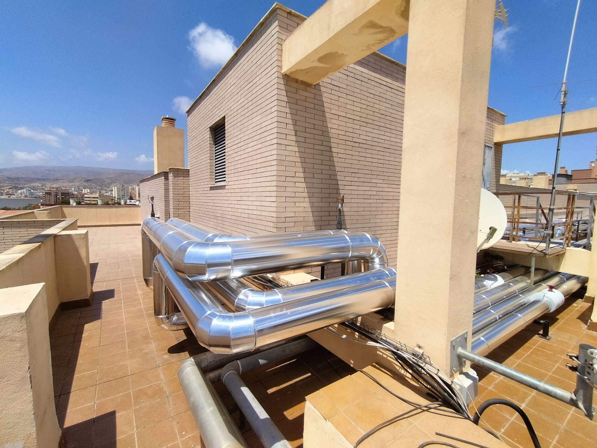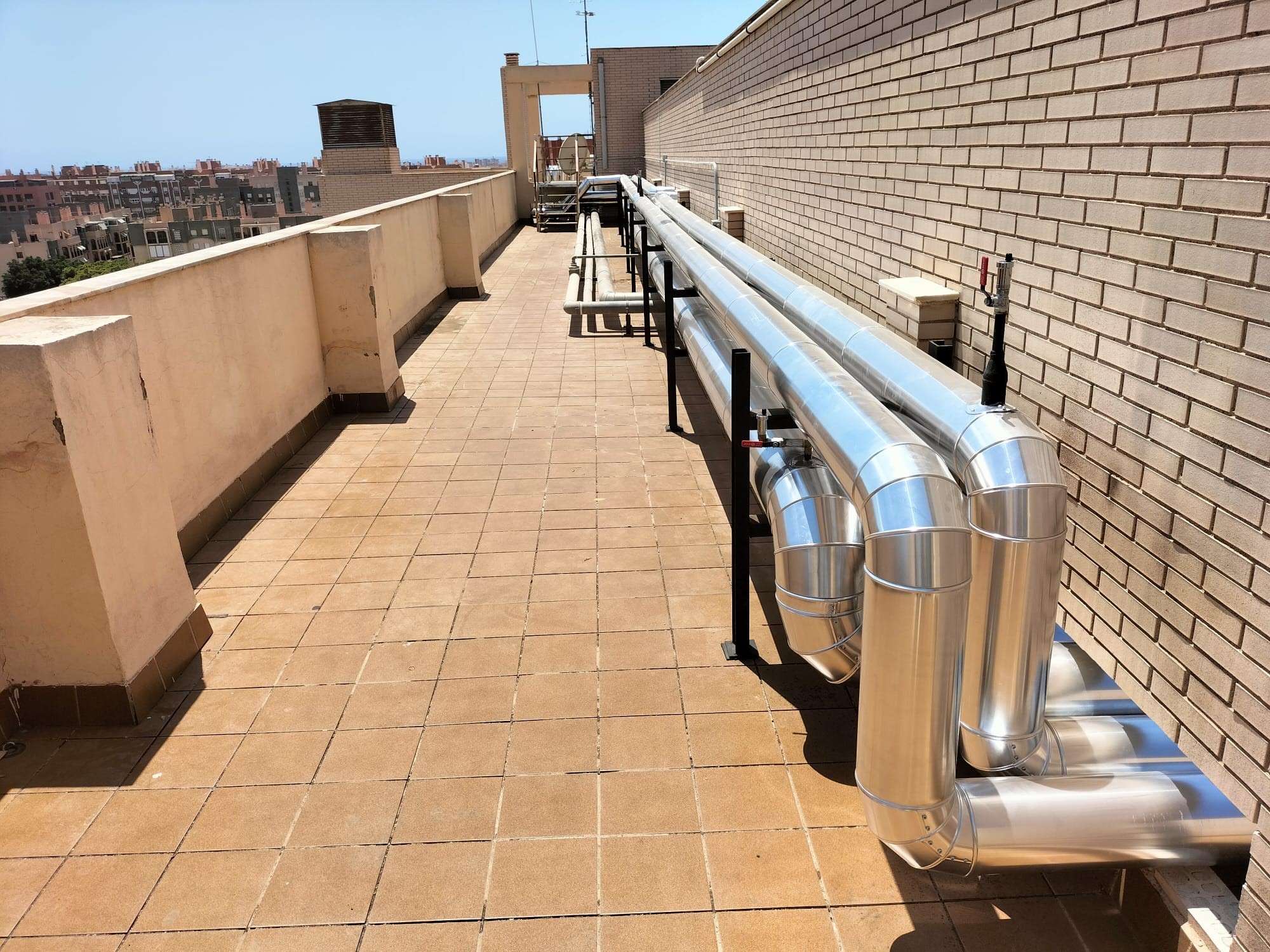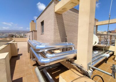 El proyecto también ha contemplado la renovación total de los cuadros eléctricos y las mangueras de fuerza necesarias para el funcionamiento del sistema. Toda la red de tuberías y colectores ha sido aislada y rematada con chapa de aluminio, asegurando tanto la durabilidad como la eficiencia energética del sistema.