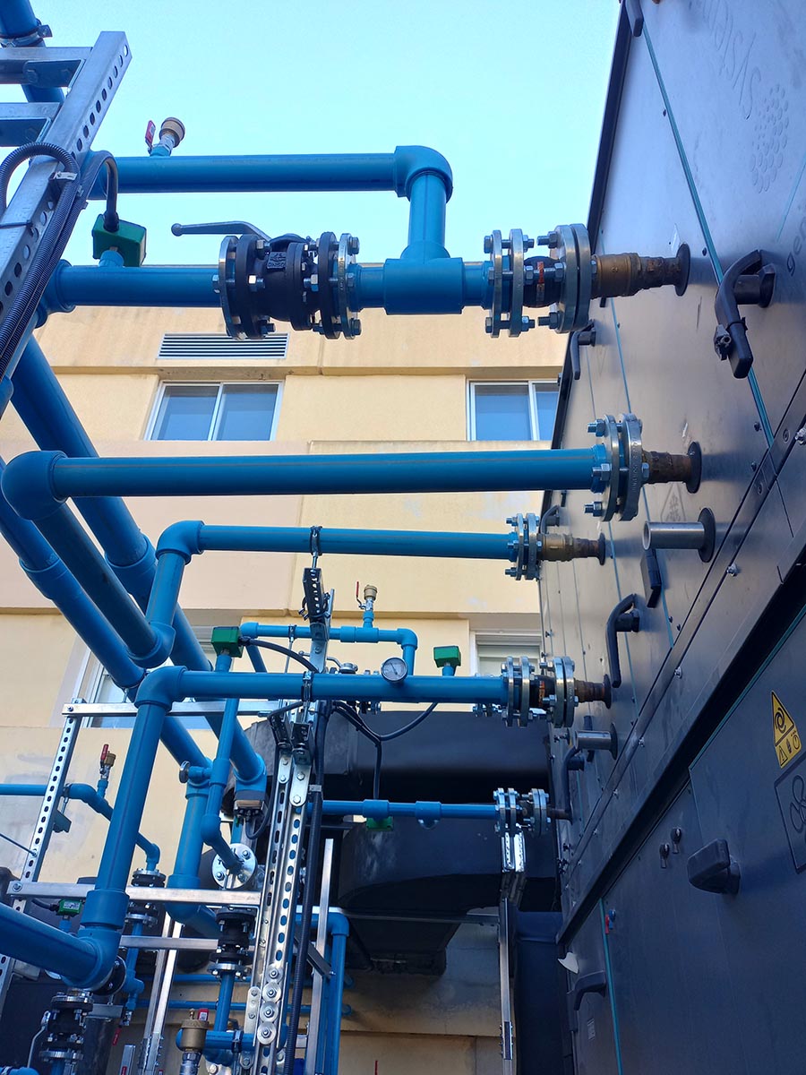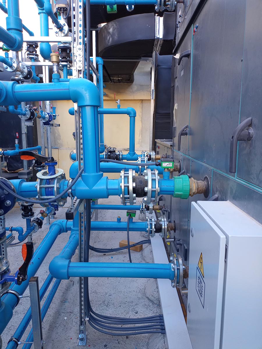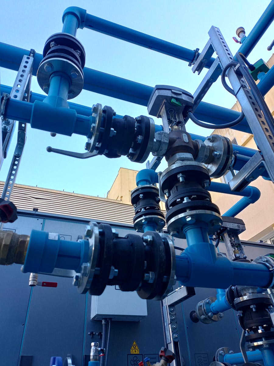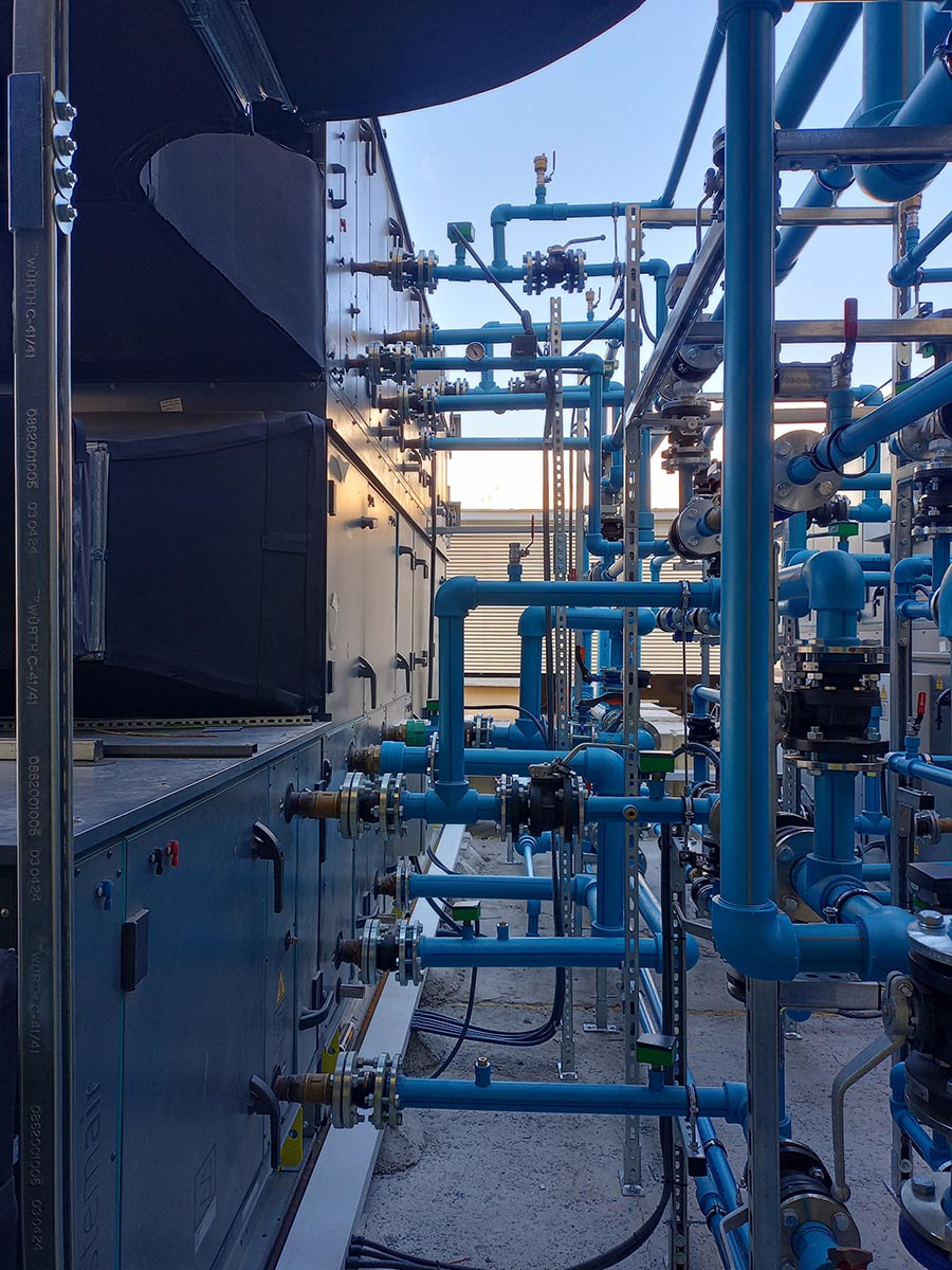En la sala de rack, se han instalado fancoils de solo frío, y se ha llevado a cabo la acometida desde el circuito de frío y calor existente a las unidades de tratamiento de aire (UTAs). La red se ha construido con tuberías de polipropileno aisladas, asegurando la eficiencia energética y el mantenimiento de temperaturas específicamente requeridas en la sala.